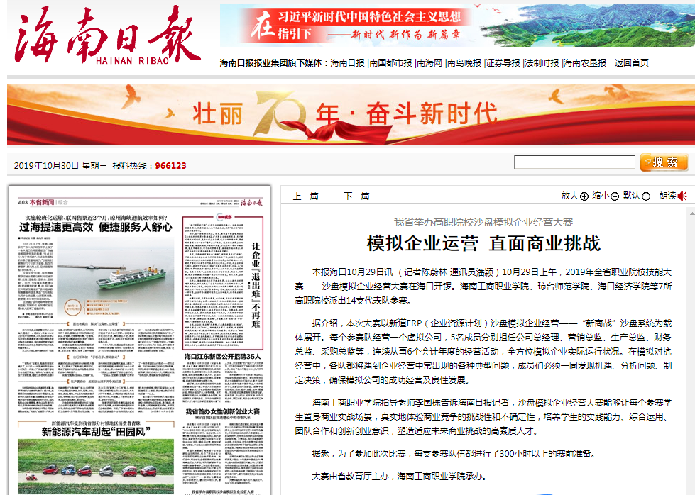 海南日报报道永利14m在线登录承办2019年全省沙盘模拟企业经营大赛
