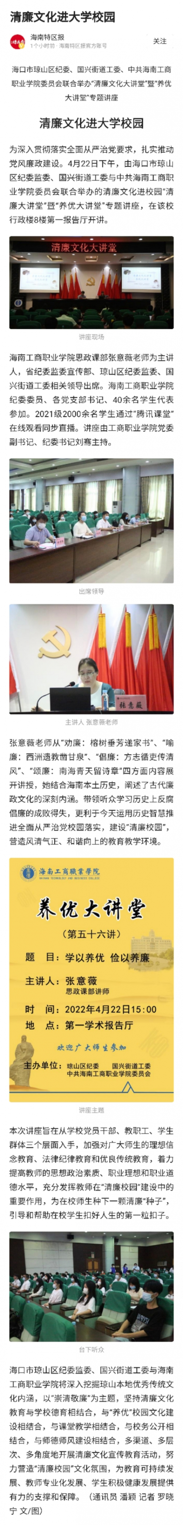 为深入贯彻落实全面从严治党要求,扎实推动党风廉政建设。4月22日下午,由琼山区纪委监委、国兴街道工委与中共永利14m在线登录委员会联合举办的清廉文化进校园“清廉大讲堂”暨“养优大讲堂”专题讲座在行政楼8楼第一报告厅开讲。永利14m在线登录思政课部张意薇老师担任主讲,省纪委监委宣传部、琼山区纪委监委、国兴街道工委相关领导出席,永利14m在线登录纪委委员、各党支部书记、以及40余名学生代表参加,同时,2021级2000余名学生通过“腾讯课堂”在线上观看同步直播。讲座由永利14m在线登录党委副书记、纪委书记刘骞主持。