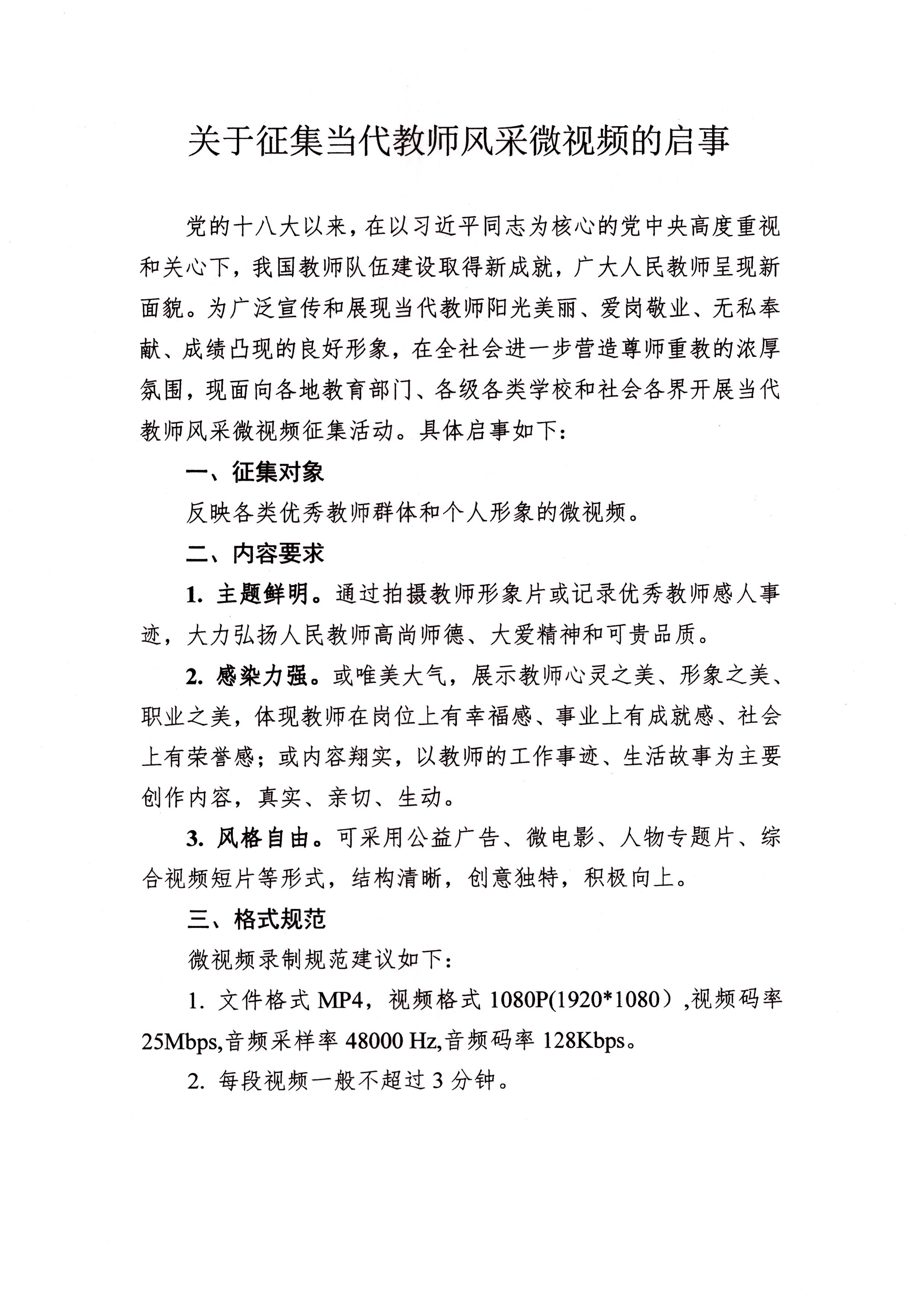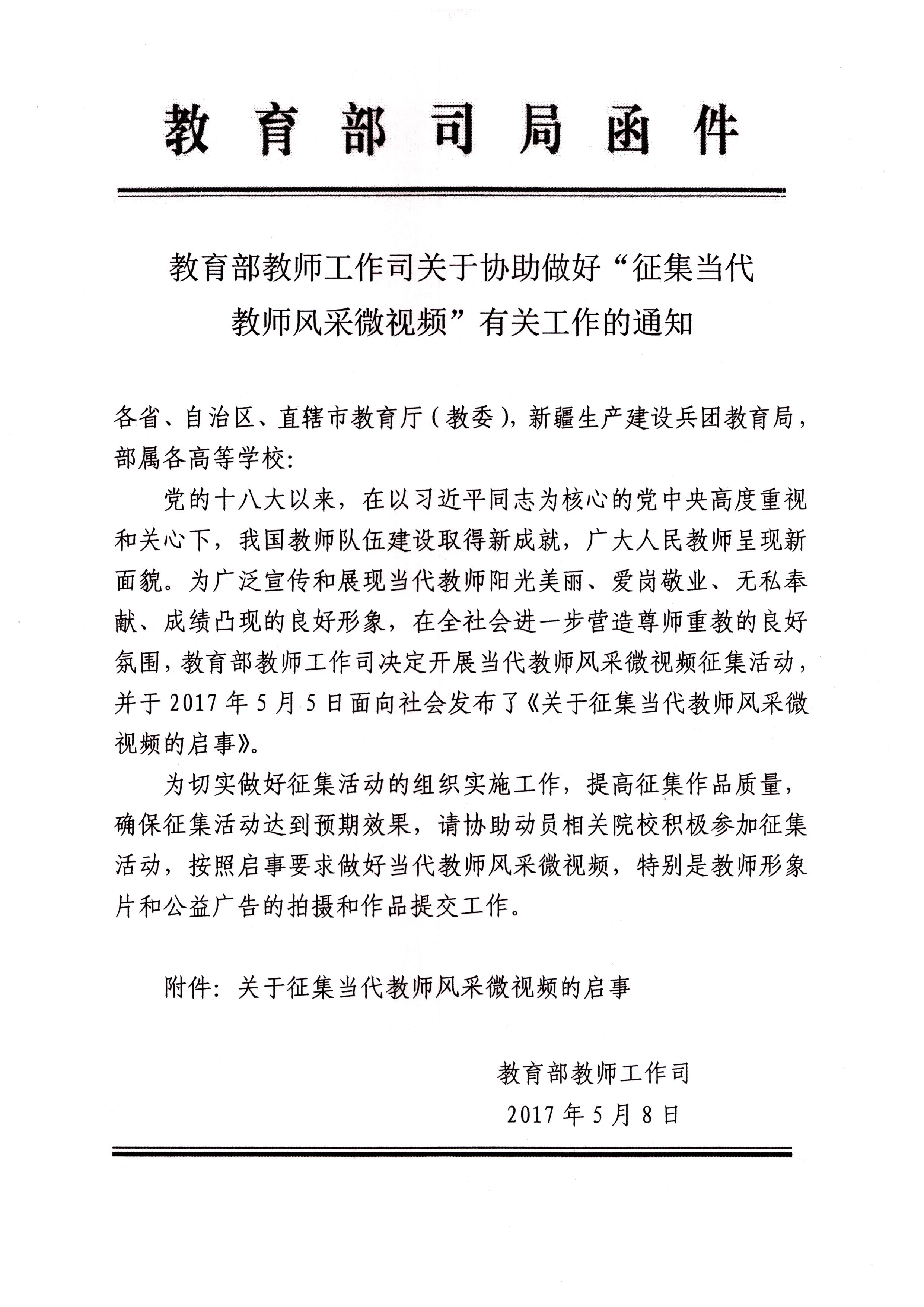 党的十八大以来,在以习近平同志为核心的党中央高度重视和关心下,我国教师队伍建设取得新成就,广大人民教师呈现新面貌。为广泛宣传和展现当代教师阳光美丽、爱岗敬业、无私奉献、成绩凸现的良好形象,在全社会进一步营造尊师重教的良好氛围,教育部教师工作司决定开展当代教师风采微视频征集活动,现将《教育部教师工作司关于协助做好“征集当代教师风采微视频”有关工作的通知》转发给你们,请按照文件要求积极组织动员,切实做好征集活动的组织实施工作。