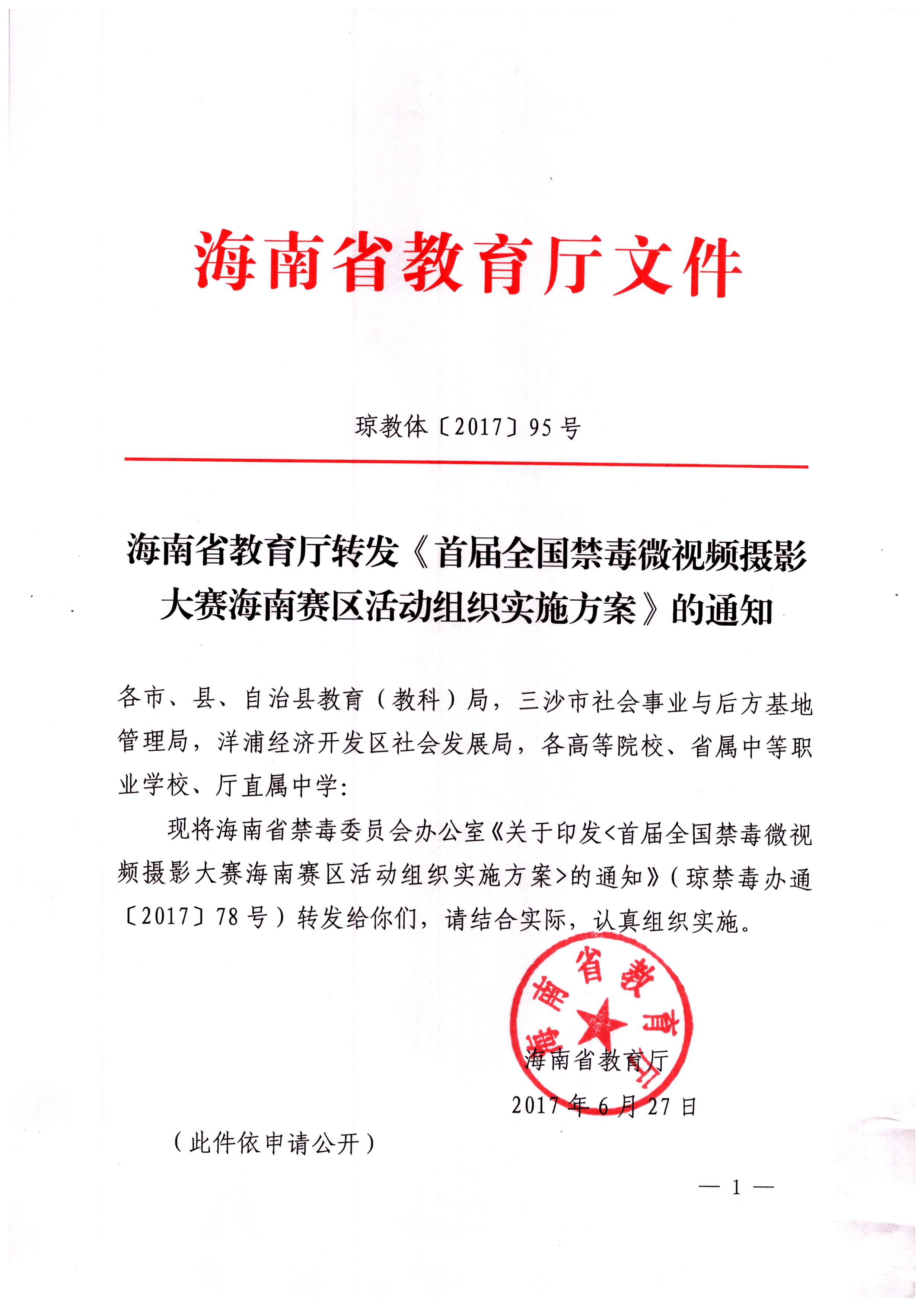 海南省教育厅转发《首届全国禁毒微视频摄影大赛海南赛区活动组织实施方案》的通知