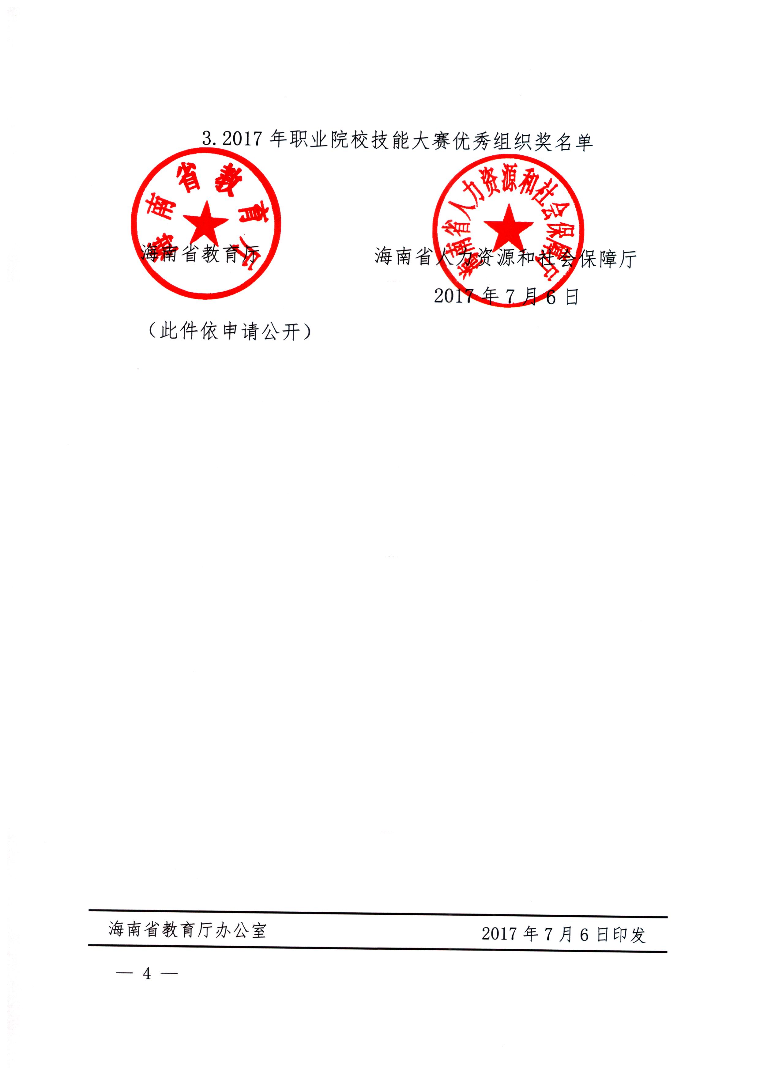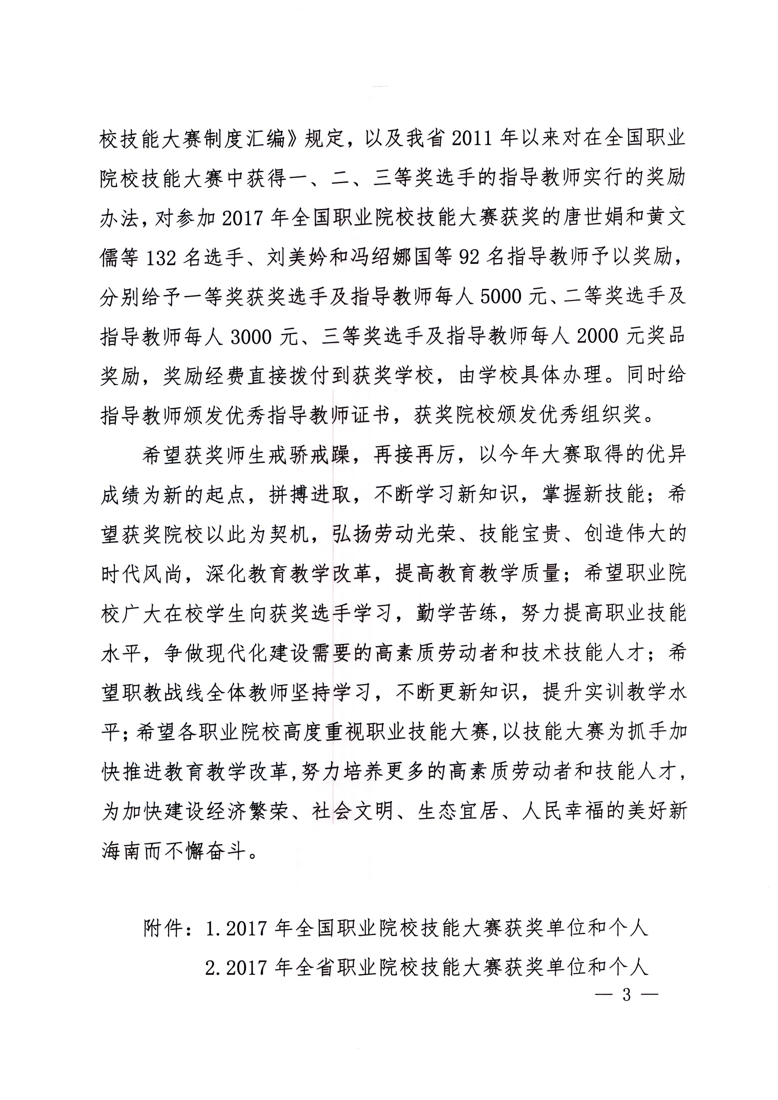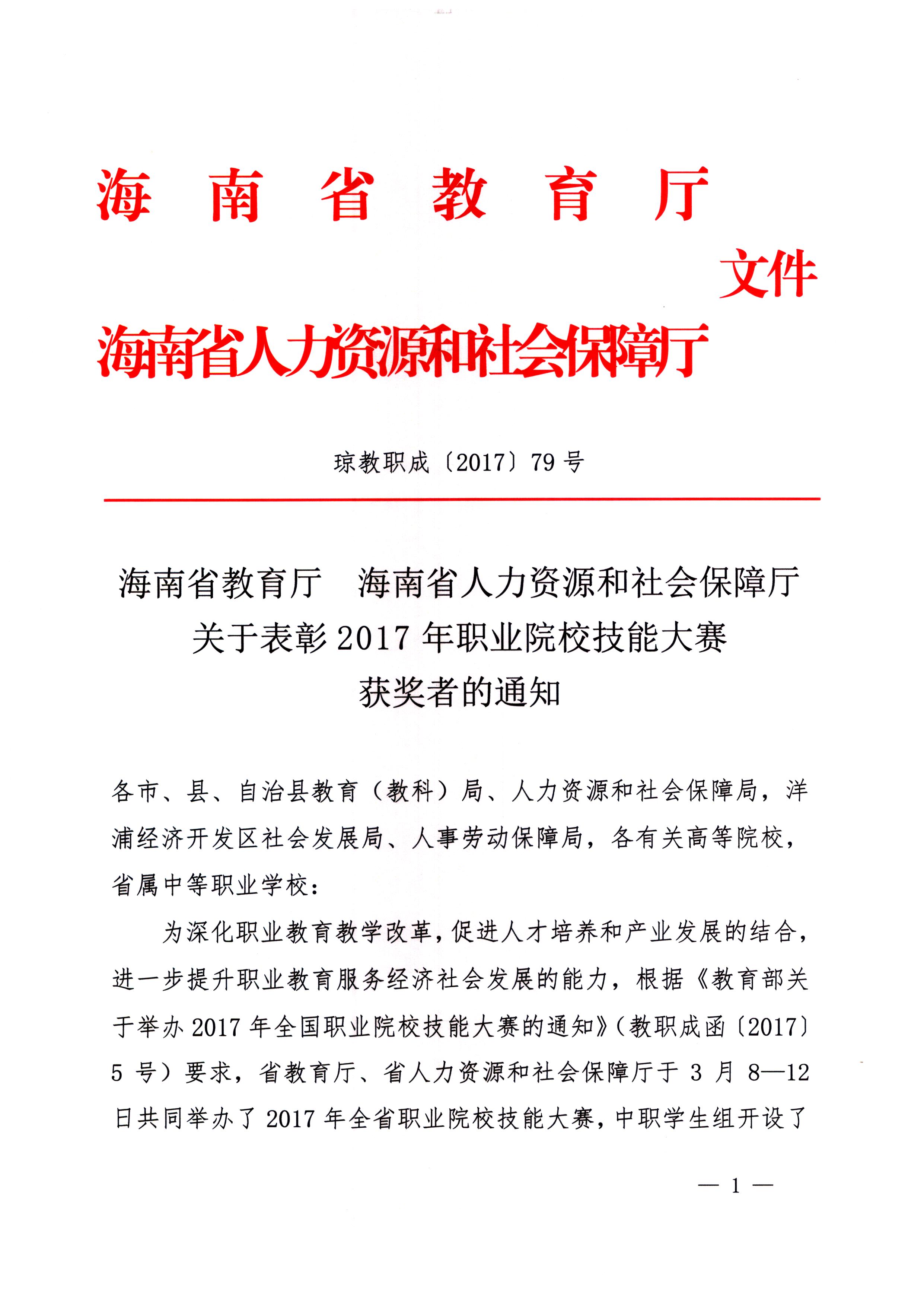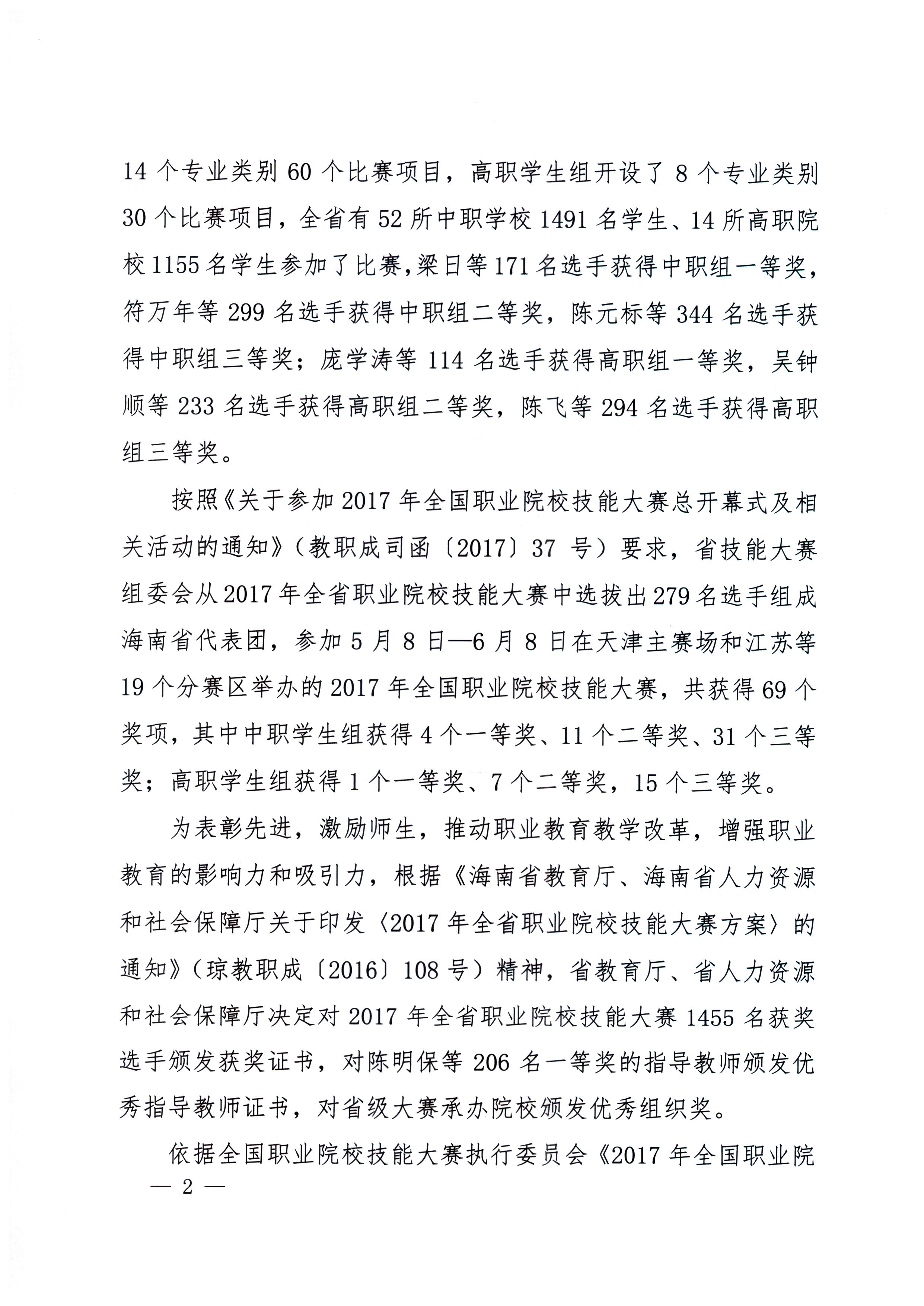 海南省教育厅 海南省人力资源和社会保障厅关于表彰2017年职业院校技能大赛获奖者的通知