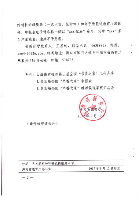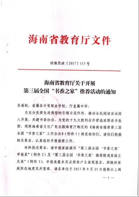 海南省教育厅关于开展第三届全国“书香之家”推荐活动的通知