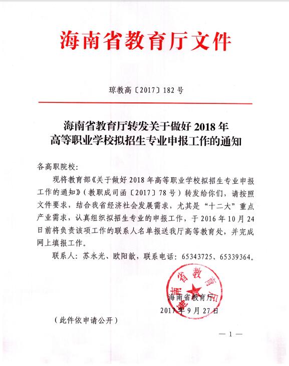 海南省教育厅转发关于做好2018年高等职业学院拟招生专业申报工作的通知
