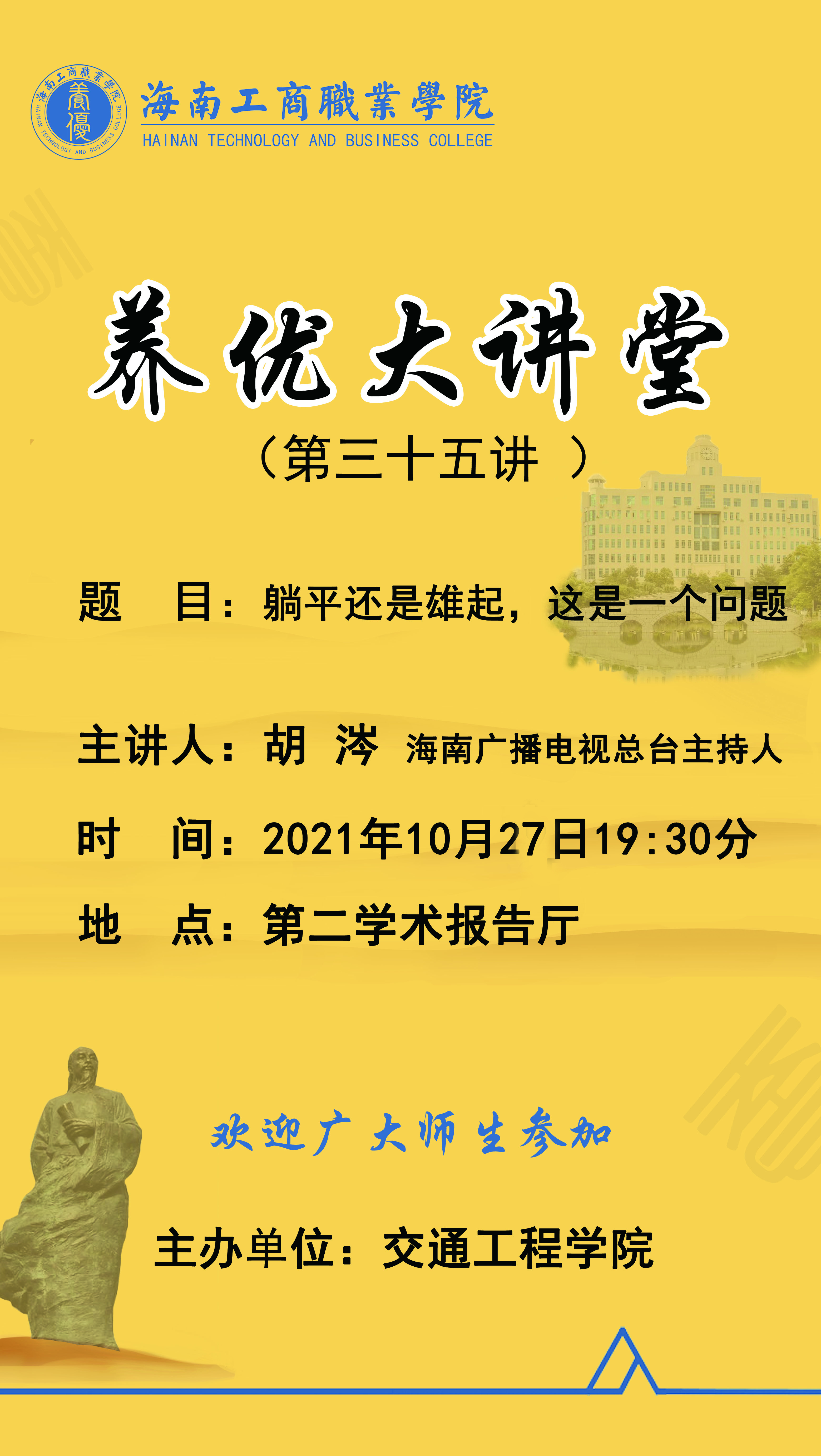 本期大讲堂的主题为:《躺平还是雄起,这是一个问题》,欢迎广大师生前来听讲。