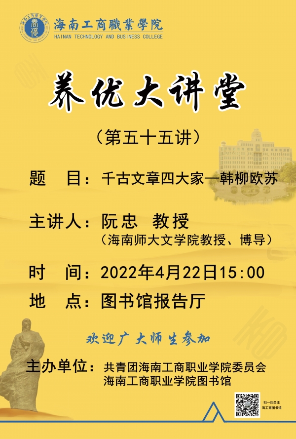 本期大讲堂的主题为:《千古文章四大家——韩柳欧苏》,欢迎广大师生前来听讲!