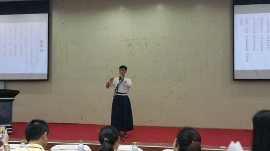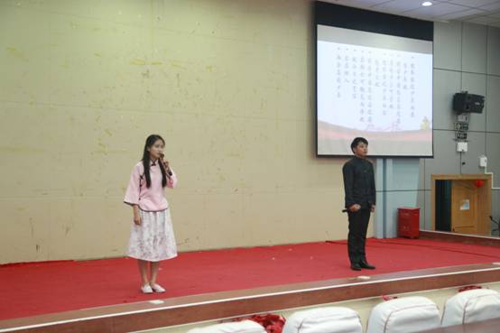 由校广播站4名同学诵读的一首《养优赋》拉开了本次比赛的序幕。比赛中,选手们字字珠玑,表演生动形象,遨游于中国古诗词古典风韵中,时而慷慨激昂、鼓舞斗志,时而深情款款、感人肺腑,意境之美,让现场观众深深沉浸其中。表演的形式也丰富多样,有的辅以PPT、服饰和道具,有的则邀请同伴用优美的歌喉营造意境,将比赛气氛推向高潮。