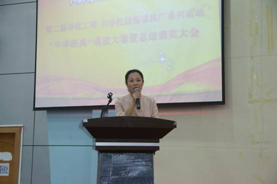 诵读大赛结束后,学校副校长陈立丽对历时一个多月的阅读推广活动从4个方面进行了全面总结。她说:“阅读推广系列活动的开展极大的丰富了校园文化生活,参与面广,涉及到全校师生以及四所中专学校、附属小学、附属幼儿园、文坛社区居委会。开展系列阅读活动,大力倡导读书求知、读书明理、读书成才之风,努力形成人人读书、人人学习的良好校园风气,构建了温馨和谐的文化育人环境,助力了校风学风建设,营造了一个更加美丽的书香校园”。