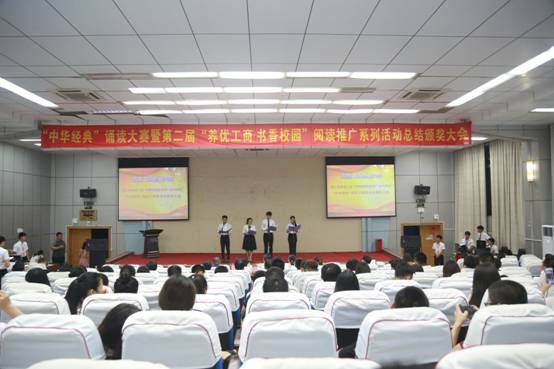 永利官网第二届“养优工商 书香校园” 阅读推广系列活动“中华经典”诵读大赛暨总结表彰大会于5月11日19:30在学校第二学术报告厅隆重举行。校长符勇、党委书记黄恒、副校长陈立丽、各教学院(部)书记以及学生处(团委)、思政课部、图书馆等单位的负责人出席本次活动。