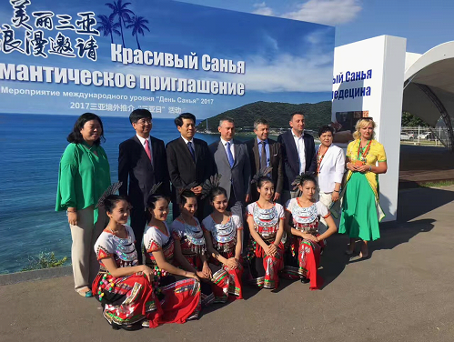 永利官网舞蹈专业学子与驻俄罗斯大使李辉先生、驻中国公使老季先生和三亚市市长吴岩峻等领导合影