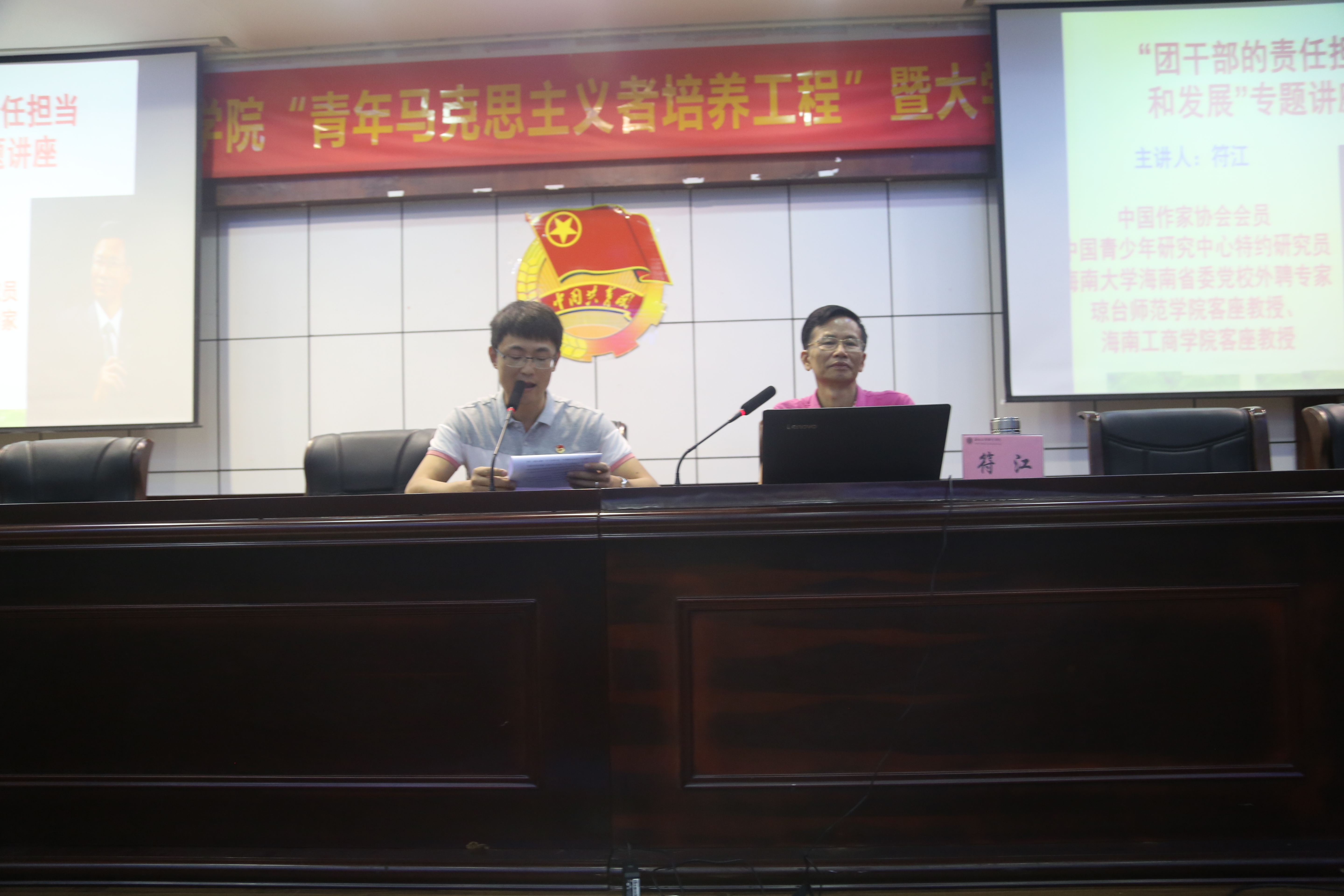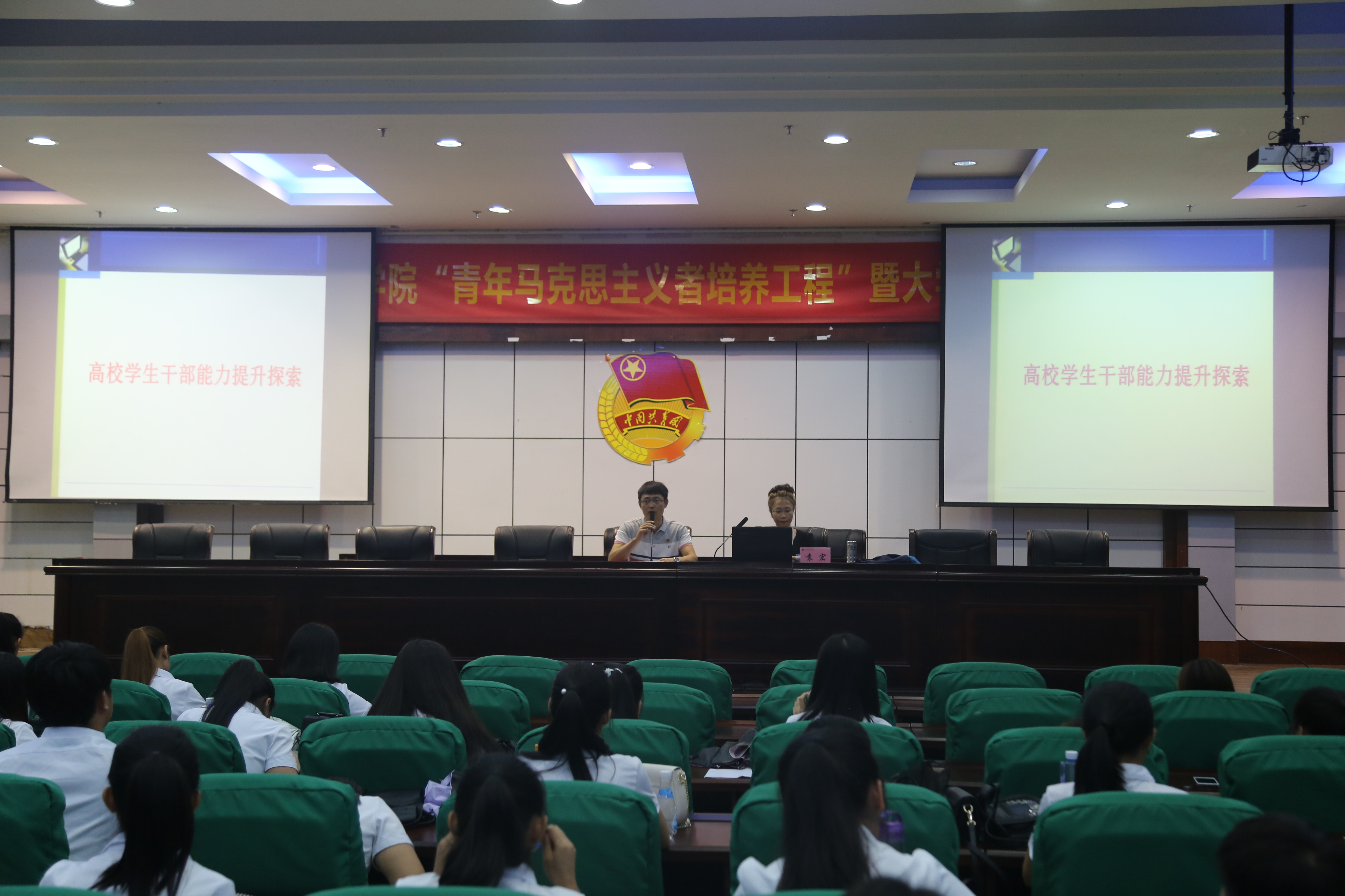 为深入贯彻学习十九大精神,学习习近平新时代中国特色社会主义思想,进一步培养学生干部求真、务实、争先的工作作风,不断加强全校学生干部的理论水平和工作能力,提高学生干部的综合素质,2018年6月8—9日,永利官网团委在第一学术报告厅举办了青年马克思主义者培养工程暨第二期大学生骨干培训班。邀请了学校客座教授符江、思政课部教授袁宏、党政办主任刘骞、思政课部主任张冬苹为大学生骨干培训班授课。