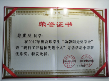 近日,由团中央学校部、全国学联秘书处、劲牌有限公司共同举办的2017年度“劲牌阳光奖学金”暨“践行工匠精神先进个人”寻访活动评选结果正式揭晓。经校级寻访、省级遴选、全国评审和网络公示,永利官网养优学子郭罡明同学在寻访活动中荣获优秀奖。