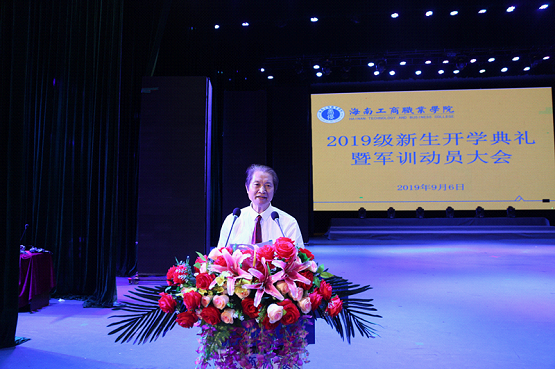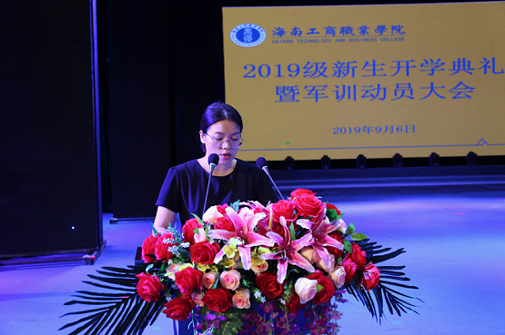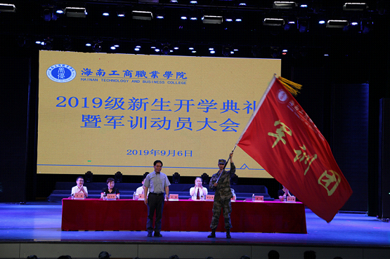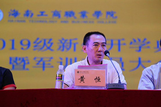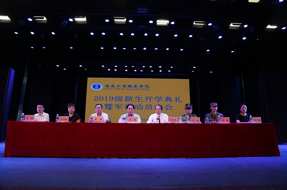 大会在庄严雄壮的国歌声中拉开序幕。琼山区武装部副部长赵巍、中国人民解放军32553部队中尉孟迪、学校董事长符勇,校长田巨平,副校长冯万红、陈立丽、李璐出席大会,各二级学院院长、书记以及2019级全体新生参加了大会。开学典礼暨军训动员大会由党委书记黄恒主持。