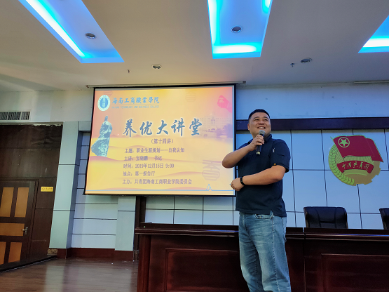 本网讯 (通讯员 倪小凤)12月15日上午,“养优大讲堂”第十四讲在永利官网第一学术报告厅举办。本次大讲堂以“大学生职业生涯规划——自我认知”为主题,永利官网团委特邀永利官网学生处处长宝晓鹏老师担任主讲,全校师生共200余人参加。