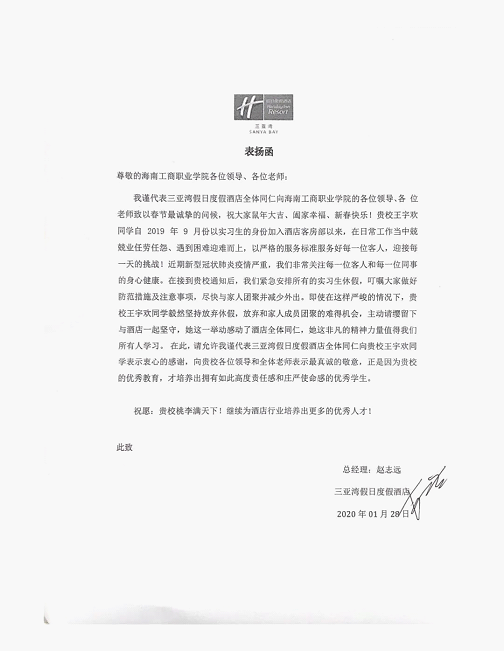 三亚湾假日度假酒店特别给学校发来王宇欢的《感谢函》。