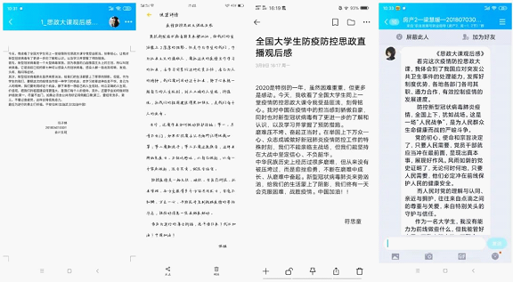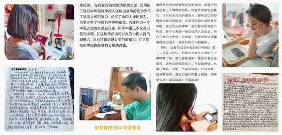 在校党委的统一安排下,海工商思政课部、学生处、各二级学院组织全校学生观看视频并组织课后线上讨论。此次课程在学生中反响热烈,广大“养优”学子纷纷提交观后感,畅谈听课后的感受及体会。他们表示,国家力量强大,人民万众一心、众志成城是打赢新型肺炎疫情阻击战的关键。在疫情防控工作中,广大“养优”学子愿意奉献自身力量,参与身边的各项防控工作,不忘践行初心使命,勇挑当代大学生的使命与担当。据悉,此次参加在线听课的学生达6000余人。