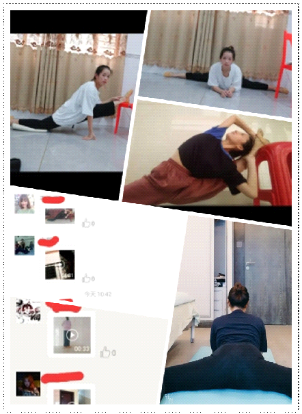 没有压腿把杆怎么办?防护栏和小板凳是她们最好的练习工具。没有练习的木地板怎么办?瑜伽垫来帮忙!看着老师在网络课程里面的操作流程,舞蹈生们认真积极地完成每一个动作,争取每个动作都准确到位。通过照片、短视频和视频连线,老师们可以实时观察她们的动作,并及时予以纠正,力争让同学们学好、练好、习得每一组专业动作。