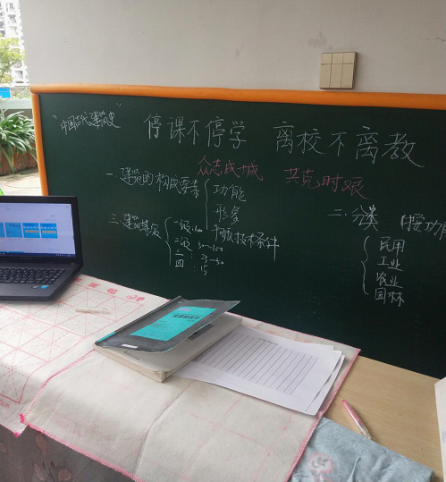 2月中旬起,我便开始筹划自己的“居家课堂”。我在网上一块与教室里外观相似的“黑板”,放上书桌当“讲台”。 其实,我哪里是在布置我的“课堂”,而是内心放不下这三尺讲台!