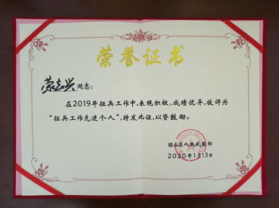 本网讯 (通讯员 蒙志兴)4月7日上午,海口市琼山区2020年武装工作会议在区人民政府举行,区委书记陈昊旻、区长王和娇在会上分别对“2019年度征兵工作先进单位”和先进个人进行了表彰。永利官网征兵工作在各乡镇、街道、各企事业单位和高校武装部中表现突出,在输送兵源数量和质量上名列前茅,是全区5所高校中唯一获得 “2019年度征兵工作先进单位”荣誉称号殊荣的学校,同时,永利官网武装部部长蒙志兴同志荣获征兵工作先进个人称号。