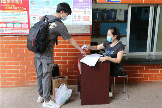 “我回来了,谢谢门卫老师!”经济管理学院的林丽真同学开心的答道,回到阔别数月的校园,口罩难掩她满脸激动的笑容。经过 “入门”环节,在志愿者的指引下,她根据辅导员事先通知的所在学院的专属通道进入校园,在间隔通过消毒环节后,来到学院报到处。按照学校要求,学生须提交《疫情防控健康承诺卡》《防控期间学生家长承诺书》、提供三大运营商出行轨迹查询结果及健康码绿码,方能完成报到流程。