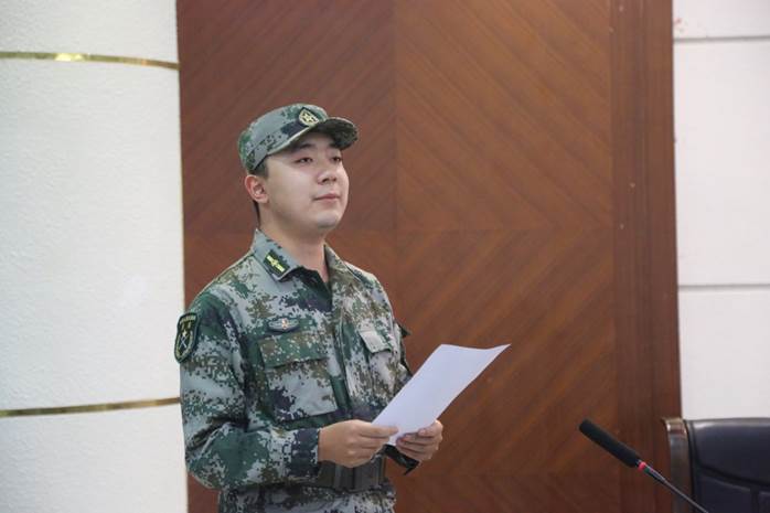 点验大会上,校学生处朱若凡老师代表新队员作了发言。会后,全体民兵队员在行政楼唐胄雕像广场进行了军事训练。