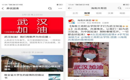 在疫情期间,作为学校疫情防控工作宣传组成员,她积极宣传疫情防控知识,呼吁学生做好自我防护。自1月21日起,她就在团委专属微信公众号“养优团青”转载推出《关于新型肺炎疫情,这是你要知道的几个最新事实》等多篇关于新型冠状病毒的宣传文章,引起师生的广泛关注。 自2020年1月24日除夕开始,倪小凤同志身在老家,带病坚持工作。她带领校团委新媒体团队运转微信公众号、微博平台,从权威网络平台上整理转载防疫资料,并组织学生拍摄“武汉加油”视频、《口罩文明倡议书,我响应》等各类宣传视频、撰写《致永利14m在线登录全体师生的一封信》、《永利14m在线登录关于做好新型冠状病毒肺炎疫情防控工作的通知》、《永利14m在线登录开通疫情防控心理支持服务》等防疫期间线上宣传稿;此外她还协助学校官网、官微发布学校各项通知。