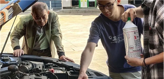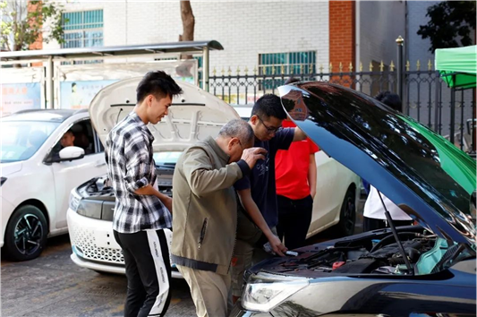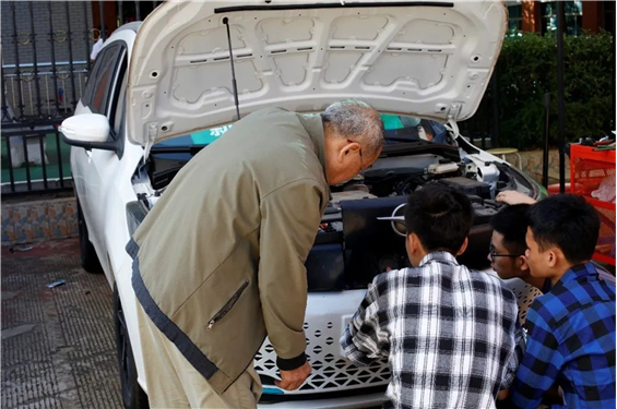 曾获“全国技术能手“称号的何振吉老师担任本次活动的指导老师。何老师认真负责,亲力亲为,带领志愿服务小分队为前来检测的车主提供热情、周到、专业的服务,面对检测发现的雨刮无法复位、刹车异响、胎压过低过高、空气滤清器堵塞等常规问题,同学们都能在老师的指导下一一妥善处理。车主们纷纷表示,在4s店要花上千块才能解决的问题,在活动中都得到免费的处理,还能得到同学们专业的汽车维护保养建议。