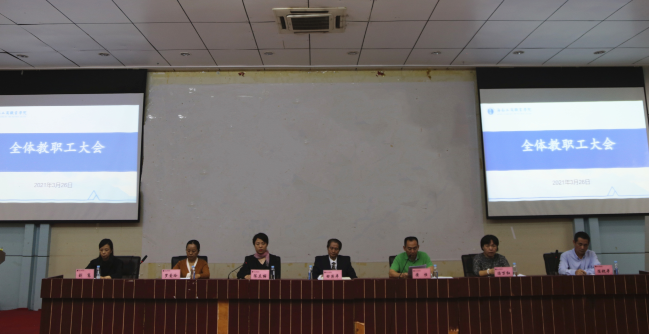 本网讯(通讯员 潘高子)为更好地总结过去,展望未来,推动学校事业发展迈向新台阶,绘就新蓝图。3月26日下午,学校在第二学术报告厅召开全体教职工大会。校长田巨平,党委书记黄恒,副校长陈立丽、冯万红、陈桄平、罗爱玲,党委副书记刘骞以及全校300余名教职工参加了大会。会议由党委书记黄恒主持。