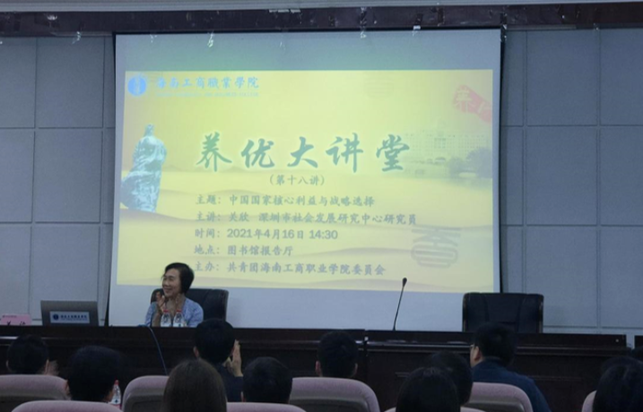 本网讯(通讯员 倪小凤)4月16日下午,“养优大讲堂”第十八讲在学校图书馆报告厅举办。本次大讲堂以“中国国家核心利益与战略选择”为主题,深圳市社会发展研究中心研究员关欣老师担任主讲,全校师生代表共100余人参加。