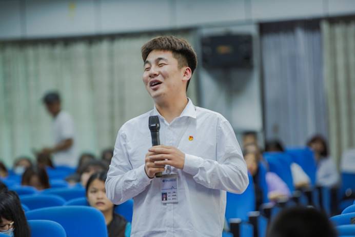 田校长以毛泽东诗词的“情”字为线,拉开讲座的序幕。他运用了讲解、诵读、视频等方式,带领大家鉴赏了《西江月·井冈山》《蝶恋花·答李淑一》《七律·人民解放军占领南京》等30余首诗词,精彩解读了每首诗词背后的故事,深情的朗诵、生动的讲解带师生们感悟伟人的深厚的家国情怀。整场讲座中,田校长对毛泽东诗词熟记于心、脱口而出,令台下师生赞叹不已。在互动交流环节中,田校长慷慨激昂为大家朗诵了“老三篇”中的《纪念白求恩》一文,赢得了师生们的阵阵掌声。