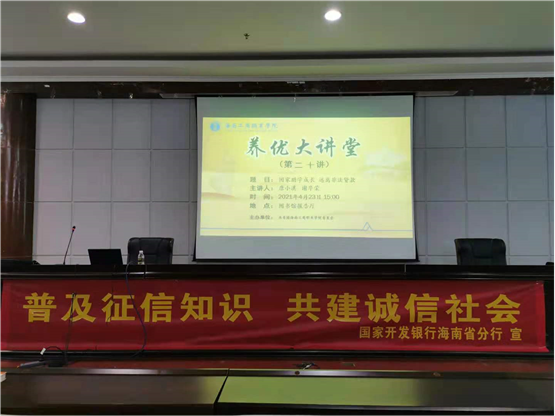 本网讯(通讯员 宋金易慧)4月23日下午,“养优大讲堂”第二十讲在学校图书馆报告厅举办。本次大讲堂以“国家助学成长 远离非法贷款”为主题,国家开发银行海南省分行客户经理唐小淇和谢华荣担任主讲,全校师生代表共100余人参加。