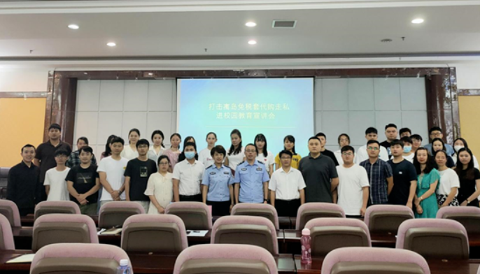 海口海关缉私局一级警长、法学硕士陈佳玮警官任主讲人,省打私办一处处长徐鹏飞同志、教育厅党委办陈友同志出席宣讲会,全体辅导员和学生代表共80人参会。