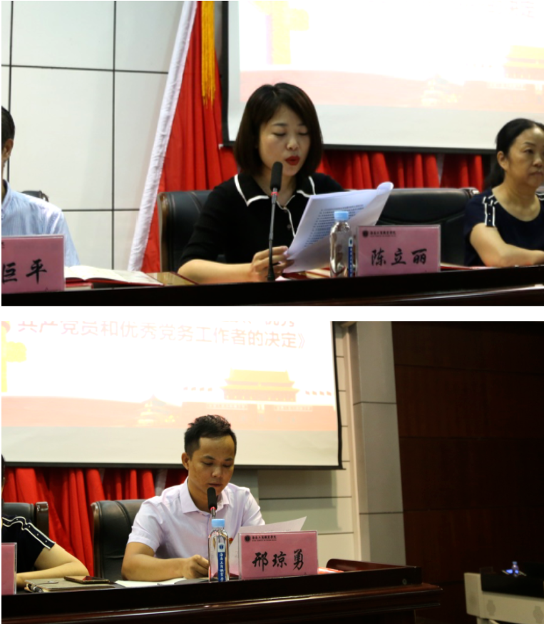 会上,党委委员陈立丽副校长宣读了《中共海南省教育厅委员会关于表彰优秀共产党员、优秀党务工作者和先进基层党组织的决定》;党委委员邢琼勇宣读《中共永利14m在线登录委员会关于表彰先进基层党组织、优秀共产党员和优秀党务工作者的决定》;主席台领导为受表彰的“两优一先”获奖代表颁奖。