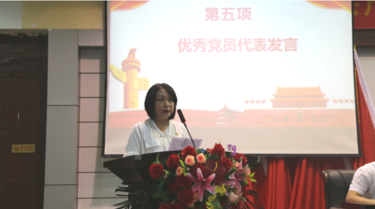 优秀党员代表曹晓莉老师上台发言。她从一名基层思政课教师的角度出发,畅谈了自己平凡生活中秉承良心和诚心,用一件一件的小事,一点一滴的行动去履行一名党员教师的职责。
