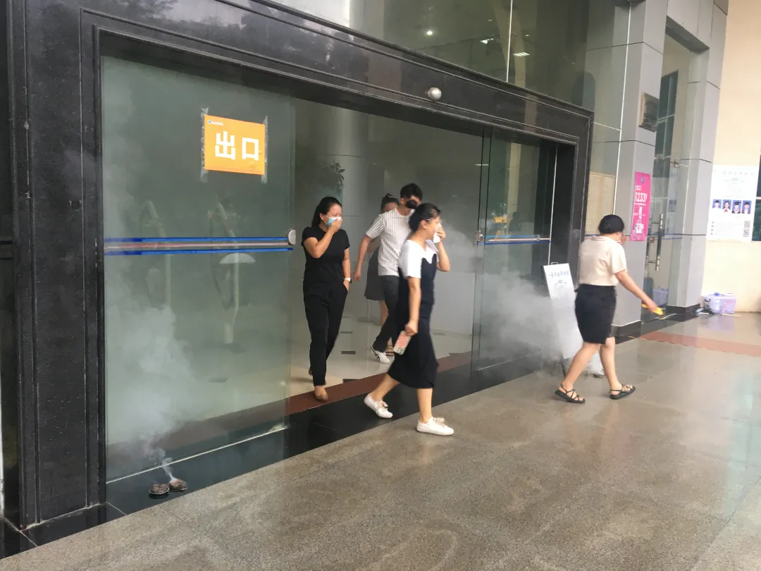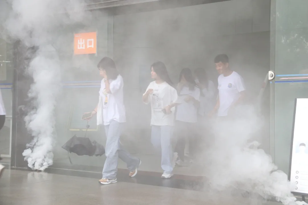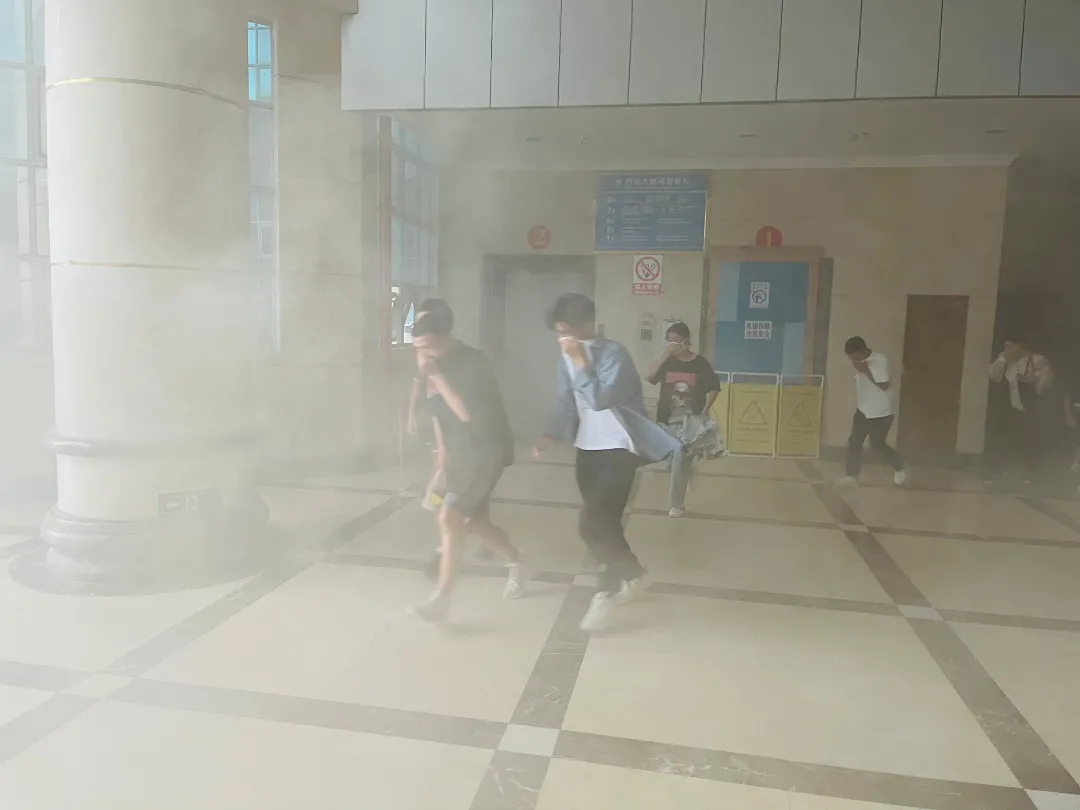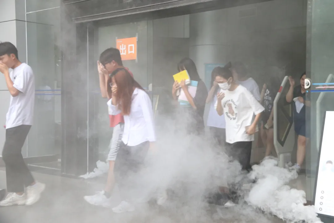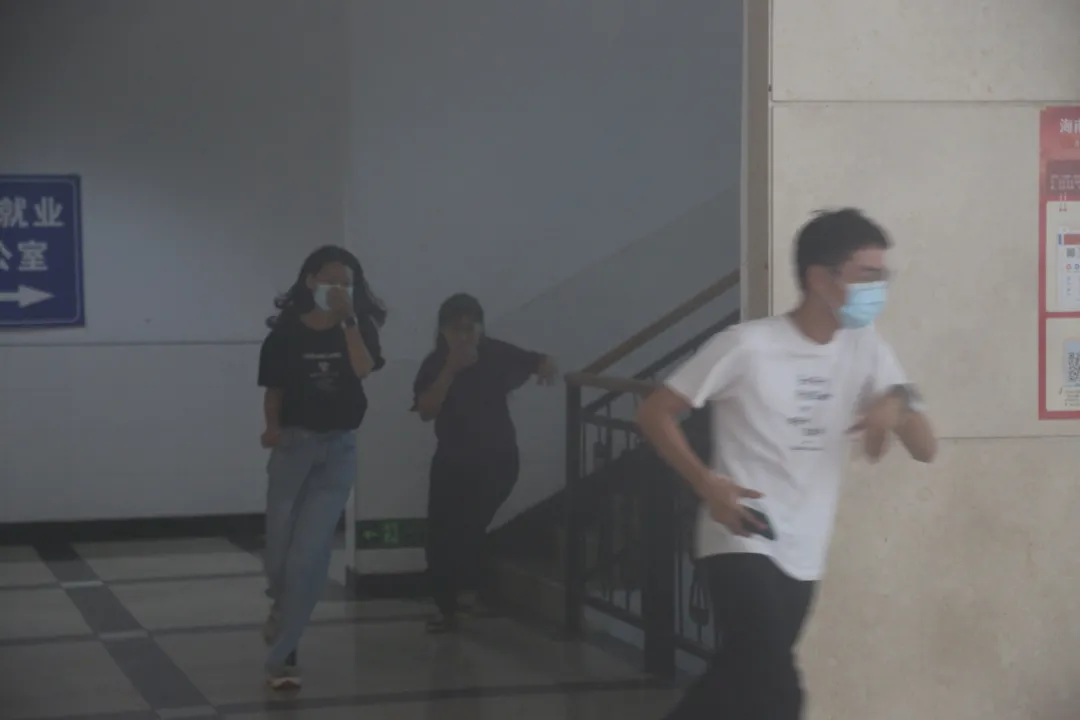 16时30分,图书馆和行政大楼的1楼入口处、7楼办公区浓烟弥漫,随着急促的警报声响起,消防广播发出指令:“请注意,发生紧急突发事件,请大家有序从安全通道撤离。”消防演练正式开始。