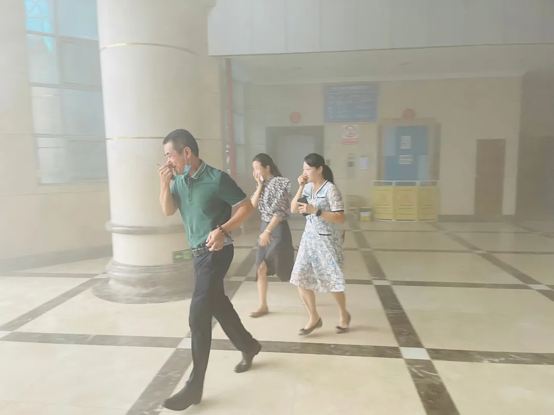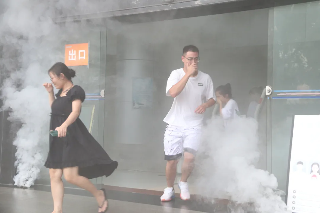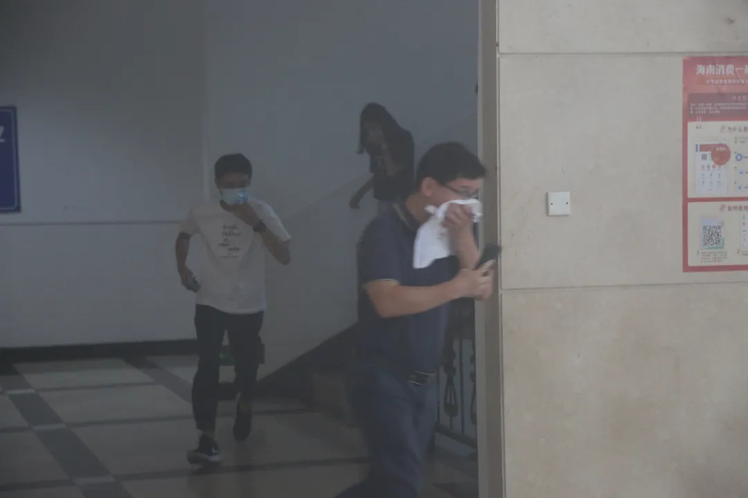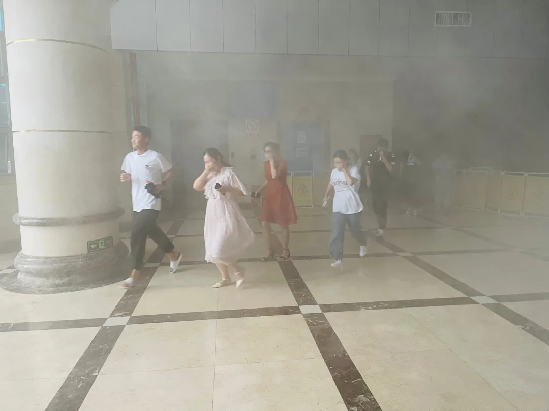 16时30分,图书馆和行政大楼的1楼入口处、7楼办公区浓烟弥漫,随着急促的警报声响起,消防广播发出指令:“请注意,发生紧急突发事件,请大家有序从安全通道撤离。”消防演练正式开始。