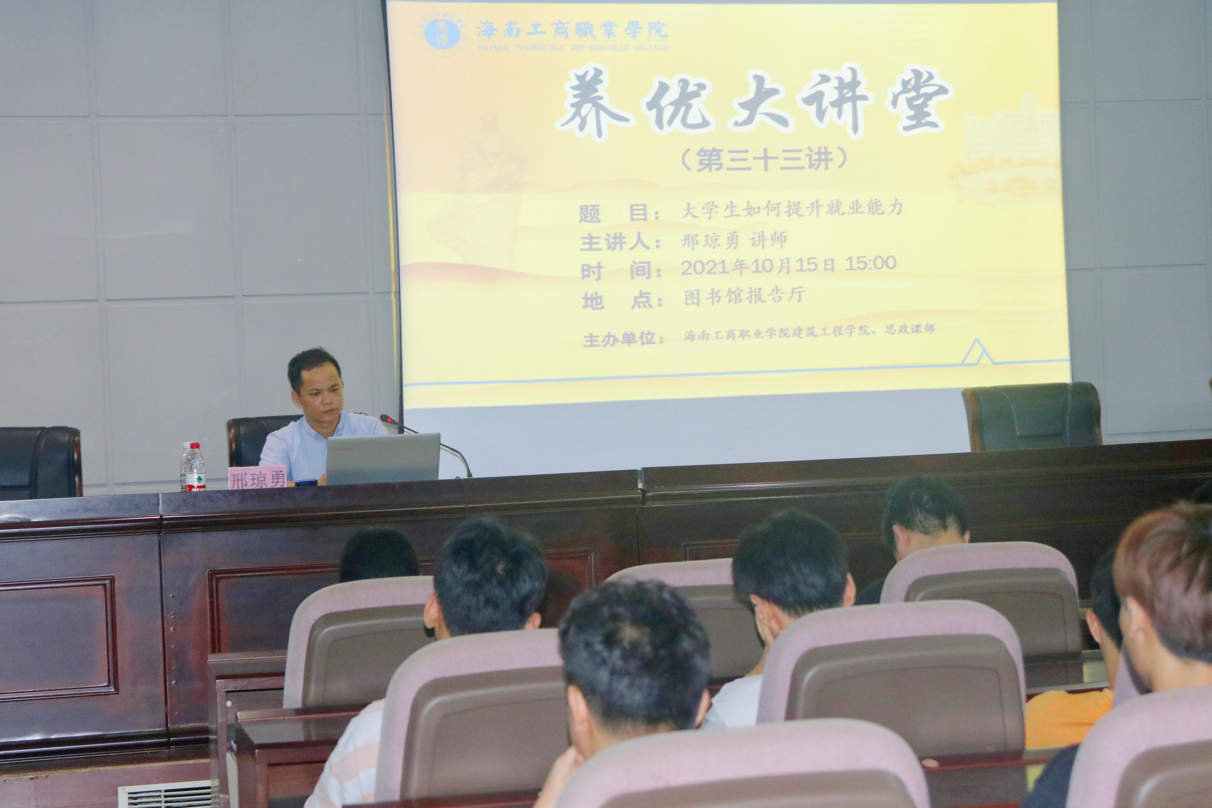 本网讯 (通讯员 王瑶)10月15日下午,“养优大讲堂”第三十三讲在永利官网图书馆报告厅开讲。本次大讲堂以“大学生如何提升就业能力”为主题,由建筑工程学院、思政课部共同主办,邢琼勇讲师主讲。