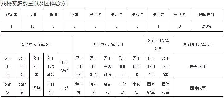 12月17日下午6点30分,为期4天的比赛在琼台师范学院正式落下帷幕,永利官网以总分290分,13金、8银、5铜的骄人成绩获普通组团体总分第一名、体育道德风尚奖两项大奖。其中,单人项目获女子100米、女子200米、女子400米、女子七项全能、女子铁饼、男子110米栏、男子400米栏、男子400米、男子1500米、男子跳远等10项冠军;男子400米还打打破了10年以来未突破的赛事记录;团体项目获男子4*400、女子4*100米、女子4*400米等3项冠军。永利官网健儿在赛场拼搏,为学校争得荣誉,诠释了“更高、更快、更强”的奥运精神。