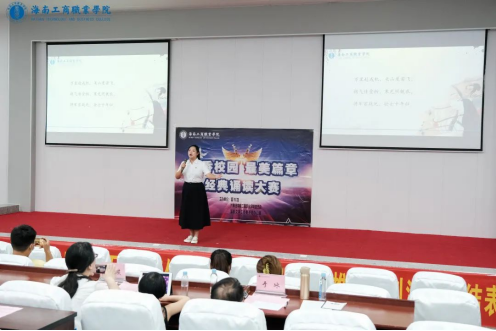 比赛现场,决赛选手们集体诵读《养优赋》拉开了活动的序幕。同学们以全新的诵读形式,用声音的魅力阐释经典作品穿越时空的精神力量,结合精美的PPT背景画面和悠扬的音乐配合,从《腾王阁序》《梦游天姥吟留别》到《木兰辞》,从《沁园春.长沙》到《月光下的中国》、从《破晓的曙光》到《祖国是什么》等经典诗文一一演绎,诵读者时而如千顶洪钟铿锵有力,时而如和风细雨轻柔绵长,时而如铁骑突出的万马奔腾,把比赛一次次推向高潮,为现场师生献上一场“星光璀璨”的视听盛宴。