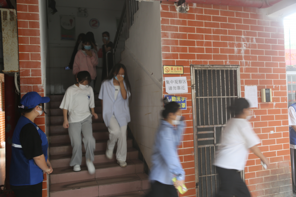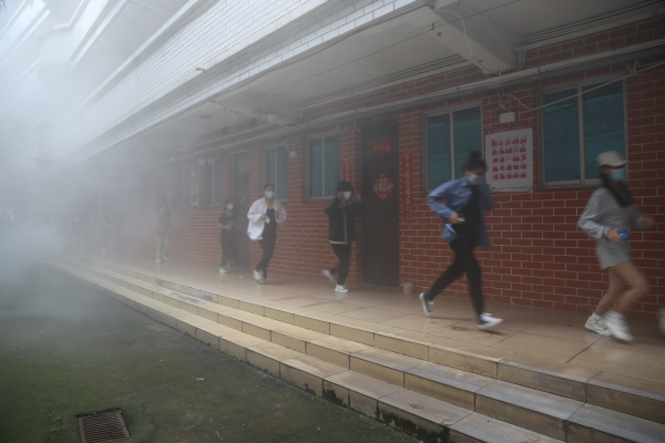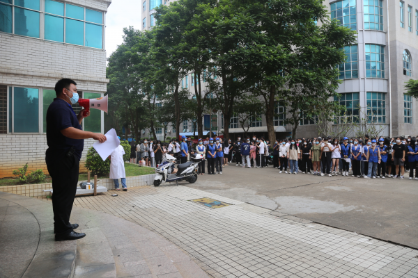 演练现场,某学生宿舍突发火情,经紧急报告后,保卫处人员迅速到达现场指挥灭火并进行应急疏散。随着应急疏散警报声响起,宿舍楼内的师生按照应急疏散预案,在消防志愿者引导下迅速有序地到宿舍楼走道外排队,并有序通过各疏散通道撤离火场。