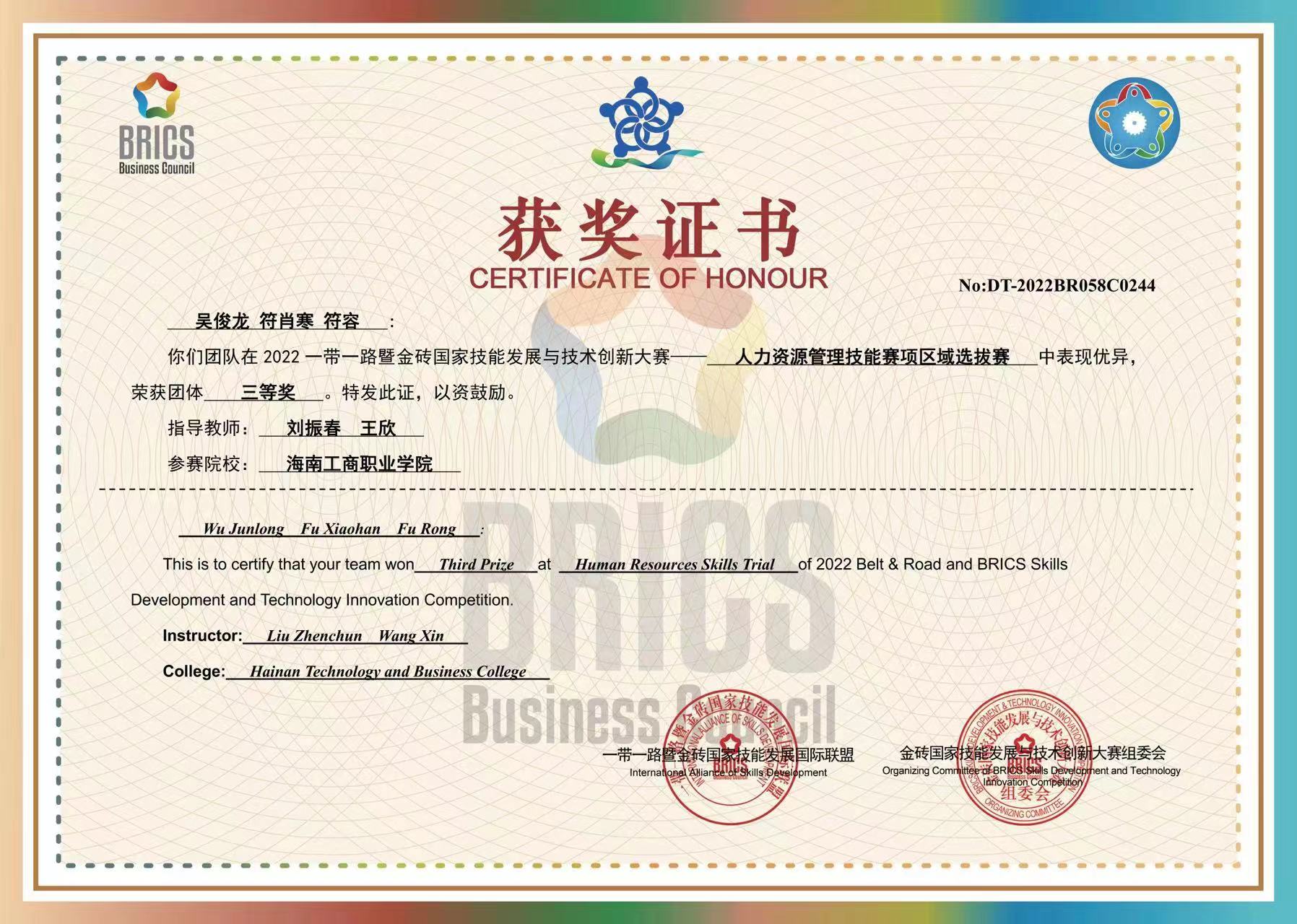 本网讯(通讯员 辛久双)11月12日,2022 一带一路暨金砖国家技能发展与技术创新大赛之人力资源管理技能赛项全国总决赛落下帷幕,永利官网人力资源管理专业学生符肖寒、吴俊龙、符容组成的永利14m在线登录代表队荣获全国总决赛二等奖的好成绩。