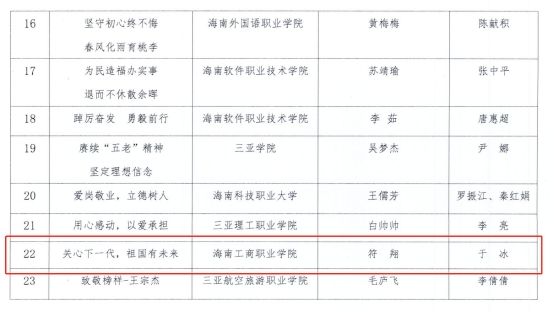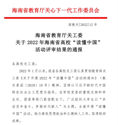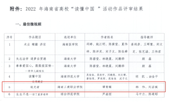 本网讯(通讯员 高 畅)近日,海南省教育厅关工委对2022年海南省高校“读懂中国”活动评审结果发布通报,永利官网推荐的2个作品获奖。其中,由韩伟、刘芸瑛两位老师指导,谭青蝶同学微视频作品《追光者》荣获“最佳微视频”;由于冰老师指导,符翔同学征文作品《关心下一代,祖国有未来》,荣获“优秀征文”奖。