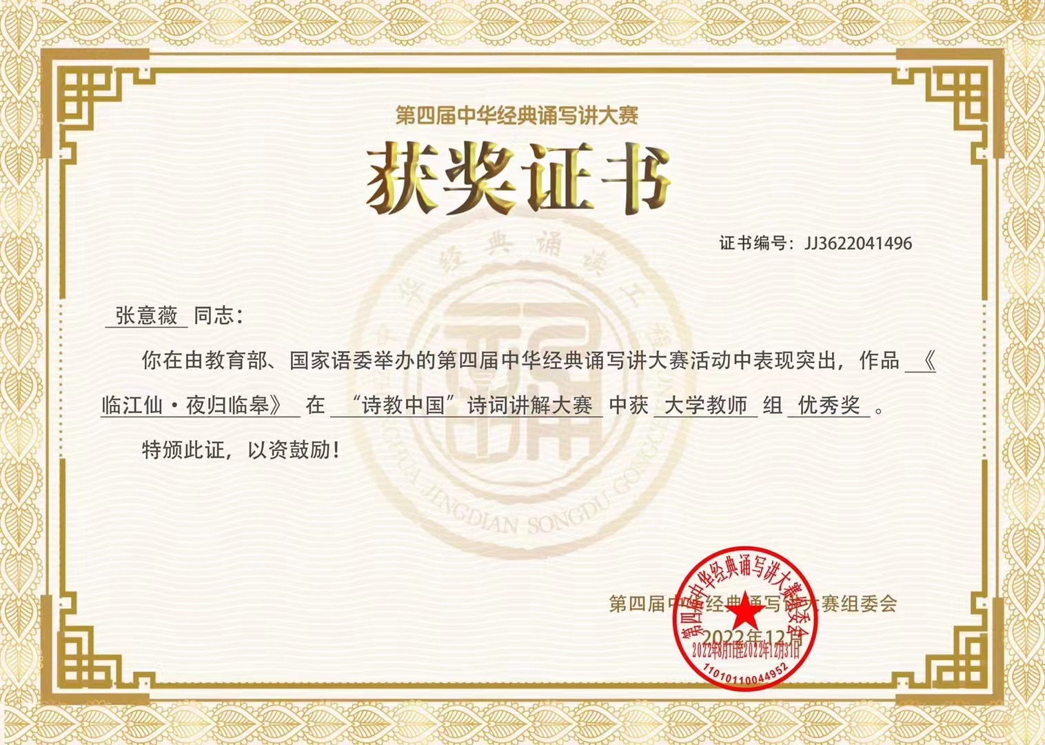 本网讯(通讯员 武 劼)近期,永利官网思政课部教师张意薇的作品《临江仙·夜归临皋》在第四届中华经典诵写讲大赛“迦陵杯•诗教中国”诗词讲解大赛中喜获优秀奖。